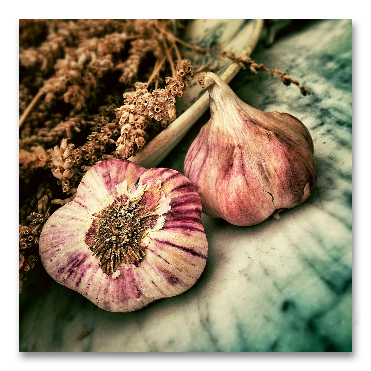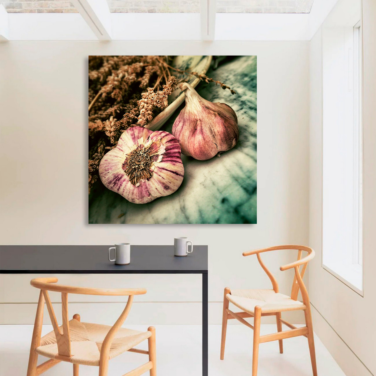 Canvastaulu – Valkosipulit pöydällä 1. Koot: 50 x 50, 60 x 60 ja 70 x 70 cm. Tulostettu laadukkaalle Hahnemühle Art Canvas taidekankaalle, tukevalle kiilakehykselle pingotettuna. Taulun syvyys noin 2,0 – 2,2 cm. Kuva jatkuu taulun reunoille, joten se voidaan ripustaa seinälle ilman kehystystä. Taulu toimitetaan ripustusvalmiina.