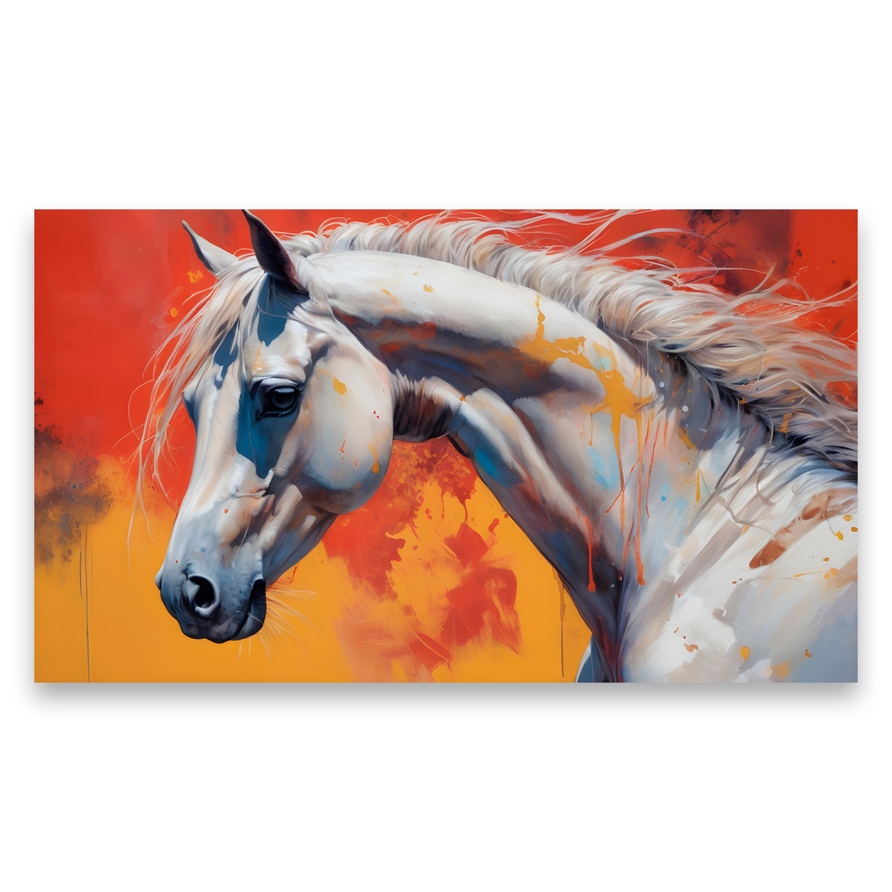 Hevonen VIII -sisustustaulu. Koot: 60 x 105 cm ja 70 x 120 cm. Tulostettu laadukkaalle Hahnemühle Art Canvas taidekankaalle, tukevalle kiilakehykselle pingotettuna. Taulun syvyys noin 2,0 – 2,2 cm. Kuva jatkuu taulun reunoille, joten se voidaan ripustaa seinälle ilman kehystystä. Taulu toimitetaan ripustusvalmiina.